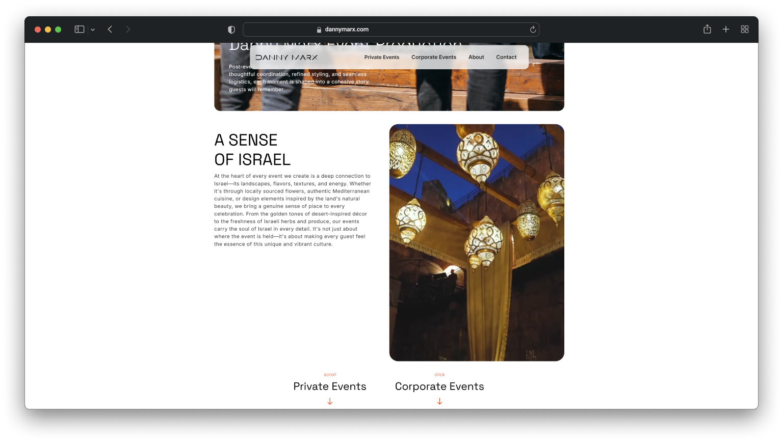 כשניגשתי לעיצוב האתר של דני מרקס רציתי דבר אחד ברור, שהאתר יגרום ליוזר לעשות תנועות בכיסא שלו. המטרה הייתה לגרום למבקר להרגיש שהוא נכנס לאווירה של אירוע, ולהוציא את הפריטים של האירועים החוצה לכל המסך.